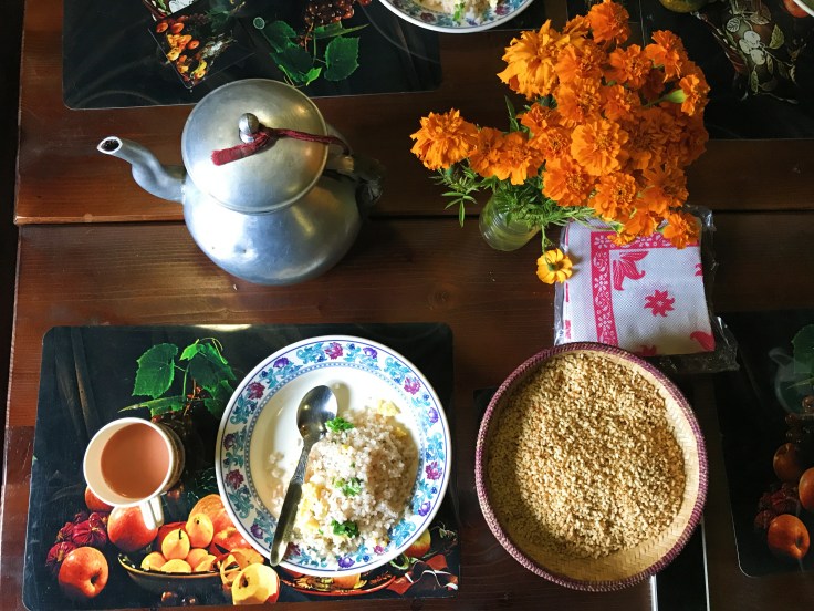 The mother served us local dishes topped with lots of love and butter. We ate Ema Datshi – which literally means chilly & cheese and it was just mind blowing. We tried some Kewa Datshi (potato), chicken maru, beef maru of the many many things. The food was shared with the family in their traditional dinning room while we talked about Bhutan’s history, religion, & culture. There were elaborate talks on military, food, rituals and tradition & their love & respect for India. It was intriguing to know about family’s history and the interesting stories of Jigme’s grandfather who was a Penelop in Paro – loosely translated as the adviser to the king.